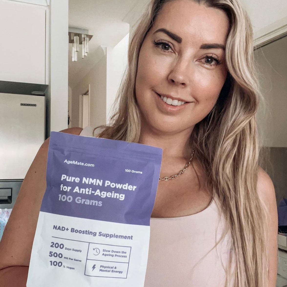 AgeMate's Pure NMN Powder is third-party tested in the USA to 99.9% purity. It's ideal for taking sublingually, mixing in water, or mixing with other foods or drinks. It comes with a 500mg scoop.